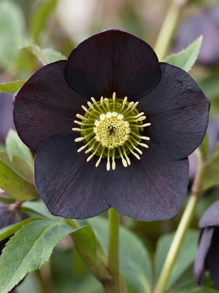 Pour les amateurs de couleurs audacieuses, la « vraie » hellébore noire n’est pas Helleborus niger, mais Helleborus orientalis et ses nombreux hybrides. Ces variétés impressionnent par leurs fleurs presque noires, parfois teintées de violet, de bleu nuit ou de reflets pourpres. Cette profondeur chromatique contraste superbement avec des étamines jaunes ou vert chartreuse en leur centre, accentuant l’éclat des corolles.