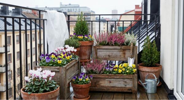 • Pour les balcons, choisissez des plantes compactes et résilientes, comme le skimmia ou la pensée d’hiver.