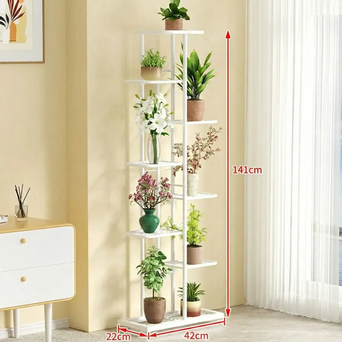 Dans espace professionnel, cette étagère haute crée séparation végétale élégante sans cloisonner complètement. À 141cm, elle structure visuellement l'espace à hauteur regard (niveau yeux ~140-160cm). Utilisez-la pour délimiter zones (accueil vs open space, coin réunion vs bureaux). Les 8 niveaux en escalier = 8-9 plantes dépolluantes qui purifient air sur grande hauteur. Version blanche s'intègre espaces professionnels lumineux, version noire apporte sophistication loft/agence créative. Compacité 42x22cm préserve espace circulation – crucial en open space !