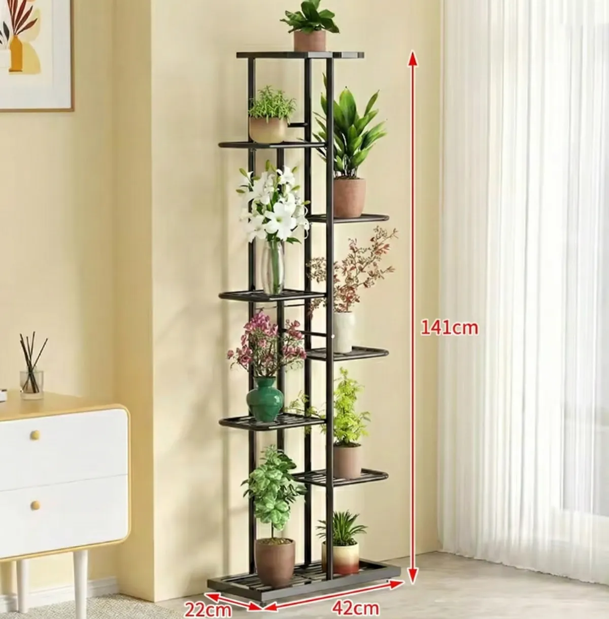 - Plateau supérieur (niveau 8) : ~24cm x 22cm – pots Ø 18-20cm ou 2 petits pots