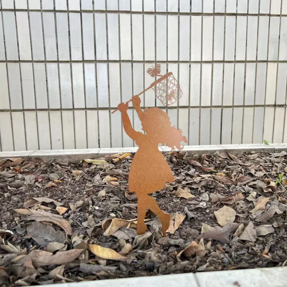 Sélectionnez une zone visible à une distance de 5 à 15 m de la terrasse, des fenêtres du salon, de la cuisine ou des chambres, afin de maximiser le plaisir quotidien de la contemplation des silhouettes féeriques lors des réveils matinaux, des cafés, des déjeuners de midi, ou des soirées avec des apéritifs crépusculaires dans les lumières dorées et rasantes de 18h à 20h en été. Ces lumières subliment les patines rouillées métalliques avec des scintillements magiques et poétiques. Évitez les passages piétiniers fréquents, intensifs et quotidiens dans les allées principales, ainsi que les circulations de véhicules, tondeuses, brouettes ou outils de jardinage qui risquent des heurts accidentels, des renversements, des piétinements, des endommagements des silhouettes, des fragilisations des piquets ou des déformations des structures délicates et décoratives. Privilégiez les fonds végétaux contrastés comme les haies persistantes de lauriers, photinias ou thuyas de 150 à 250 cm de hauteur avec un vert sombre, intense et presque noir, qui mettent en valeur les silhouettes brun orangé rouillé en les faisant ressortir visuellement pour une lisibilité, une clarté des formes découpées et des détails précis sur les accessoires, fleurs, paniers, filets et papillons. Une orientation est ou sud-est capte les lumières matinales douces de 7h à 11h qui valorisent les reliefs des découpes laser et les ombres portées de 5 à 10 cm au sol, créant des effets théâtraux, dramatiques, artistiques et photographiques, parfaits pour Instagram et partageables sur les réseaux sociaux par les jardiniers influenceurs passionnés d’esthétiques végétales et décoratives.