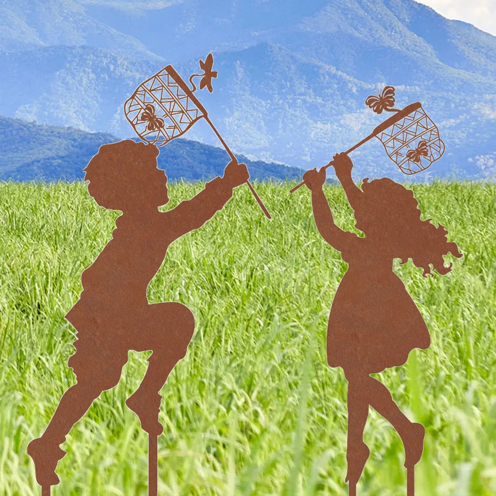 Créez des narrations visuelles et des histoires racontées en groupant 2 à 3 silhouettes espacées de 2 à 5 m, simulant des interactions sociales et des jeux enfantins comme des courses, des poursuites de papillons, des cueillettes de fleurs partagées et offertes entre complices dans des amitiés enfantines innocentes, pures, authentiques, touchantes et émotionnelles. Le garçon chassant et la fille cueillant, disposés à un angle de 45 à 90°, suggèrent des dialogues, des échanges de regards, des complicités, des tendresses douces et naissantes, ainsi que des premières amours enfantines, platoniques, poétiques et romantiques dans des jardins secrets, refuges de complots, rêves partagés et confidences murmurées avec des secrets gardés précieusement. Alternez les hauteurs des silhouettes de 34 à 38 cm pour créer des rythmes visuels dynamiques et variés, évitant ainsi les monotonies des alignements répétitifs, ennuyeux, prévisibles et plats sans relief ni intérêt pour les compositions photographiques, esthétiques, artistiques, réussies, équilibrées, harmonieuses, plaisantes et agréables lors des contemplations prolongées et méditatives. Associez des végétalisations complémentaires comme des rosiers nains de 30 à 40 cm, des lavandes de 40 à 50 cm et des santolines de 25 à 35 cm qui encadrent les silhouettes dans des écrins végétaux colorés et parfumés, attirant les pollinisateurs comme les abeilles, papillons, bourdons et syrphes auxiliaires. Cela renforce les thématiques de la nature, de la biodiversité et des équilibres écologiques des jardins vivants, animés et bruissants avec les bourdonnements et vols incessants des insectes butineurs et récolteurs de nectars et de pollens.