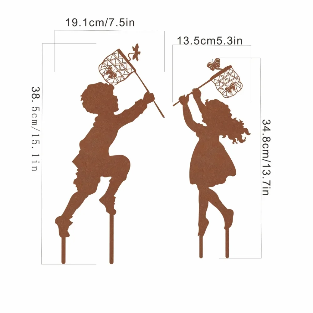 Apportez une touche féerique et poétique à votre jardin avec cette silhouette en métal en forme de fée pour la décoration de jardin extérieur, aussi charmante qu’authentique ! Elle présente une finition avec une patine rouillée naturelle qui lui donne un aspect vieilli et élégant. Deux modèles sont disponibles : un garçon de 38,5 cm et une fille de 34,5 cm, tous deux découpés au laser avec une grande précision. Le piquet de montage permet une installation simple et rapide dans le sol. Le métal résistant aux intempéries garantit une durabilité de 5 à 10 ans en extérieur permanent. Ce style art déco romantique et fantaisiste transforme votre pelouse, votre massif ou un coin de jardin en un espace magique et enchanteur !
